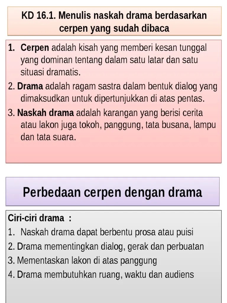 Dalam teks drama penjelasan mengenai latar akting maupun lighting ditulis dalam tanda kurung dengan dicetak miring. Pilih peristiwa yang menarik dalam cerpen atau novel kemudian ubah menjadi dialog antar tokoh. Sebelum mengubah cerpen atau novel menjadi naskah drama yang terlebih dahulu harus diperhatikan adalah memahami isi cerita dengan baik. Merubah cerpen menjadi naskah drama. Memparafrase naskah cerpen ke naskah drama melalui metode mind mapping.